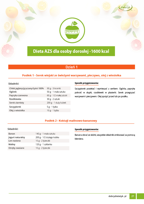 Opracowanie zawiera zbiór niezwykle ważnych informacji dla osób borykających się z atopowym zapaleniem skóry. Dodatkowo przygotowano dwa 7-dniowe jadłospisy dla dzieci i osób dorosłych. Program dietetyczny został opracowany przez zespół dietetyków specjalizujących się w leczeniu żywieniowym chorób skóry. W diecie zadbano o najważniejsze potrzeby żywieniowe z jednoczesnym ograniczeniem produktów zaostrzających AZS.